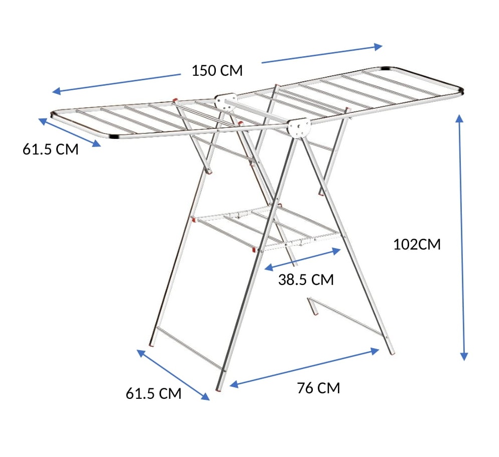✅ SINGLE-LAYER DESIGN WITH SIDE WINGS – This stainless steel drying rack offers a spacious 150 cm length with two 61.5 cm wide side wings, giving you ample room to dry clothes, towels, and more without overlapping.