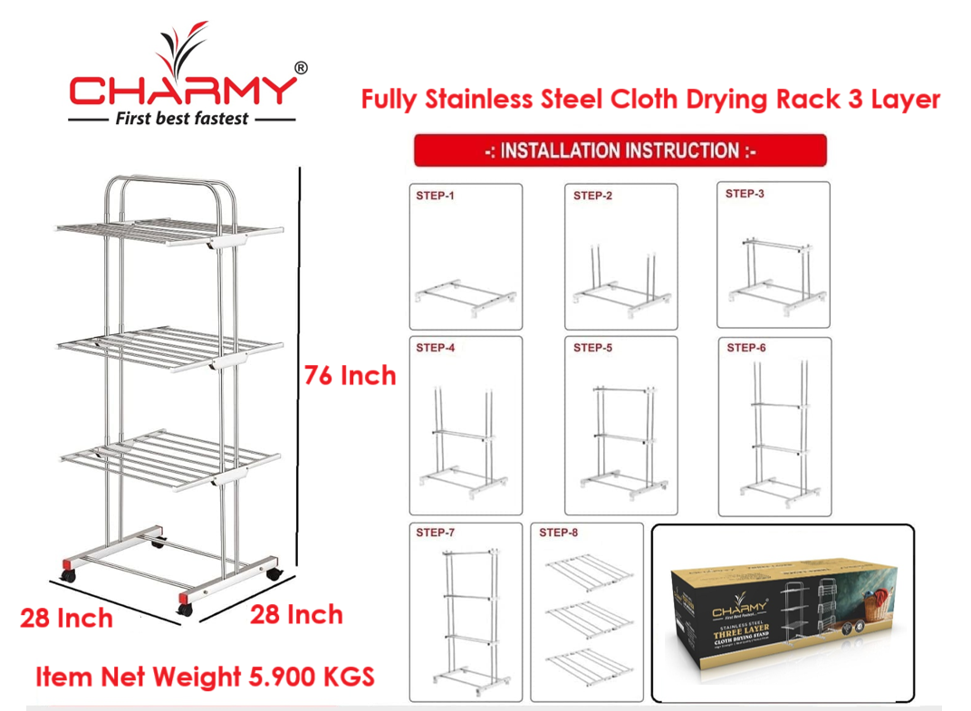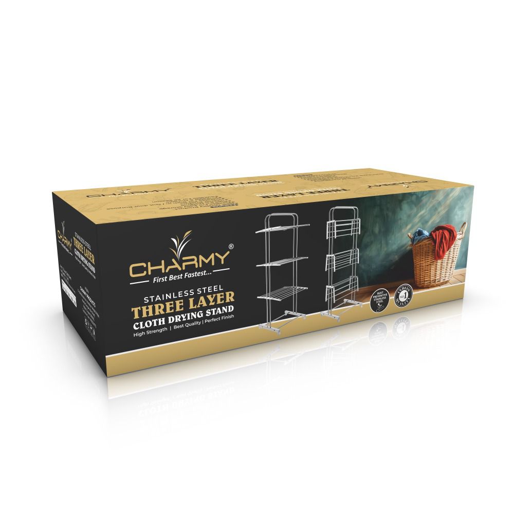 Charmy Foldable Cloth Drying Stand with Wheels | Heavy-Duty Stainless Steel Multi-Layer Laundry Rack | Adjustable Wings, Portable & Rust-Resistant Clothes Dryer