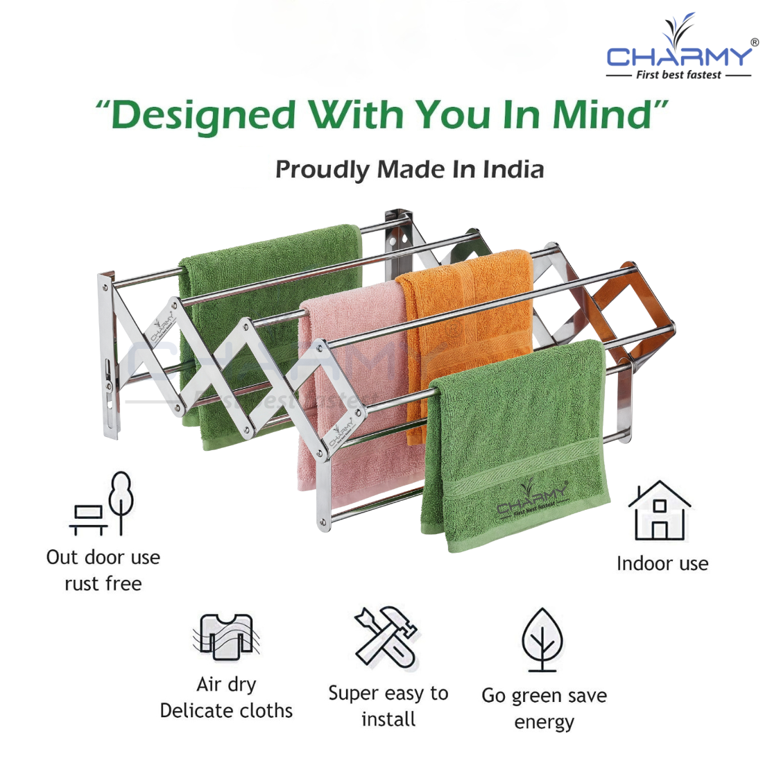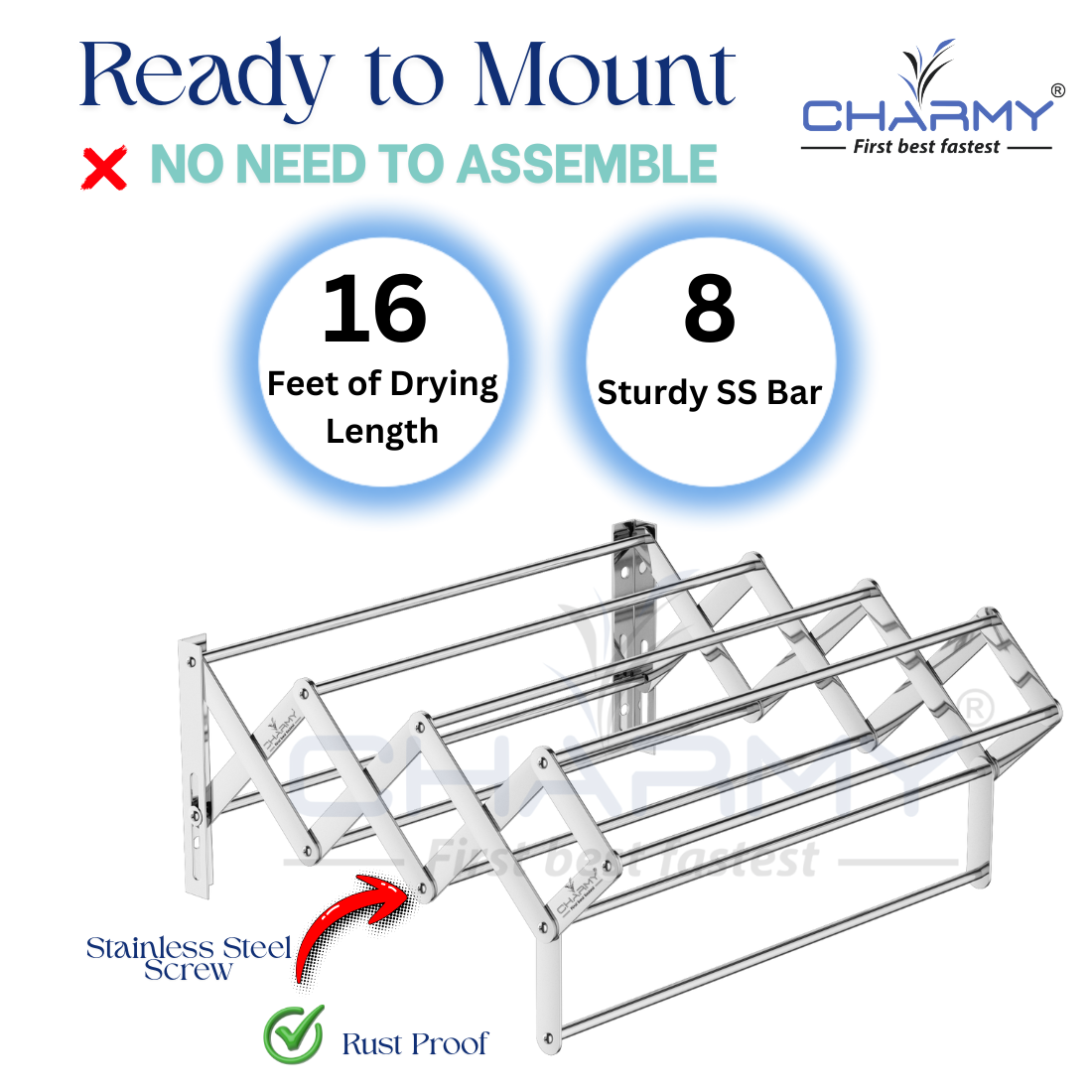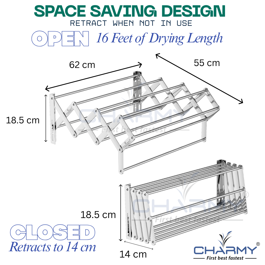 Its strong stainless steel bars and screws ensure stability and long-lasting performance, while the open structure allows better air circulation for faster drying. The compact folded size keeps your space neat while still offering maximum drying capacity when expanded.